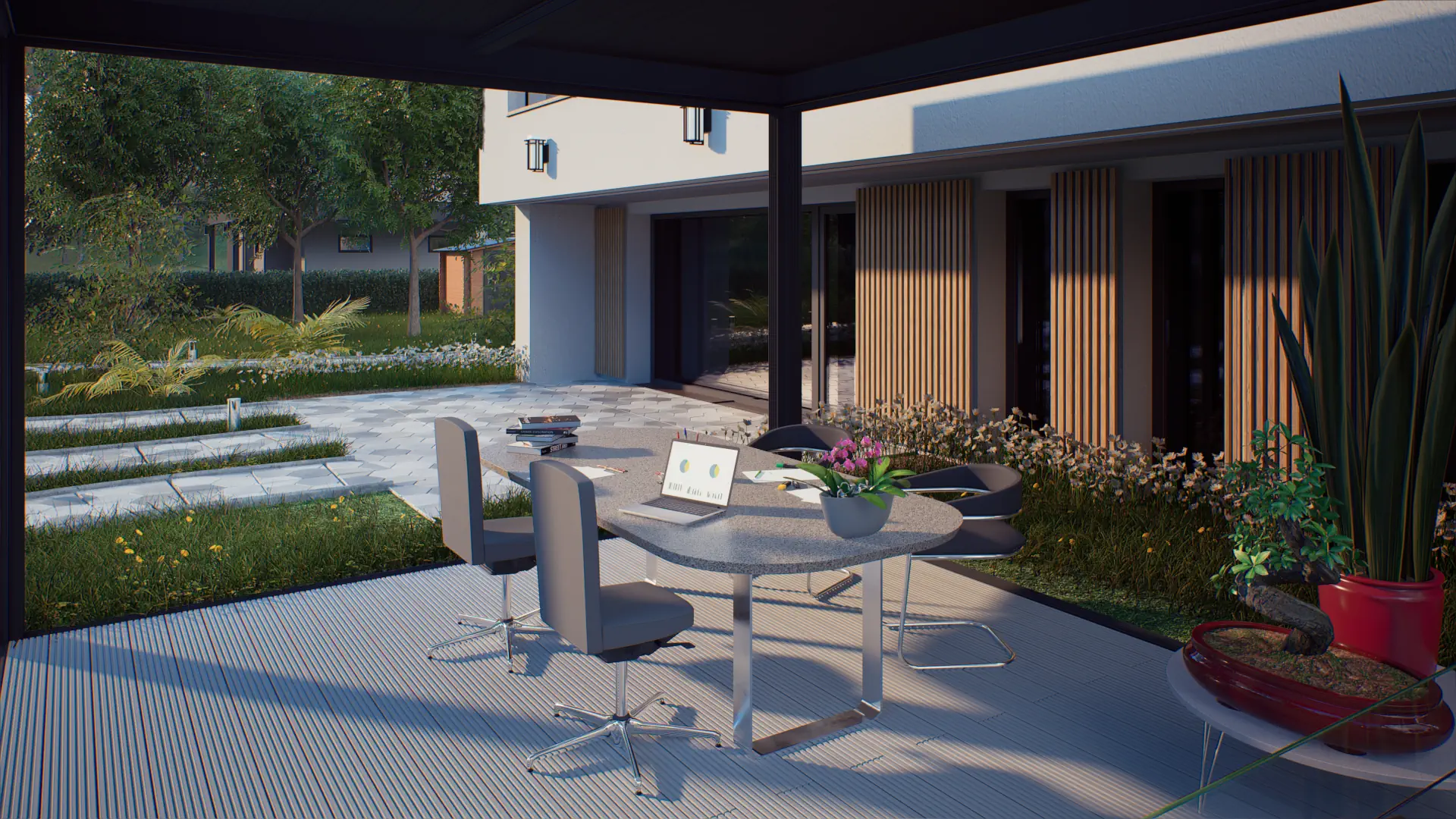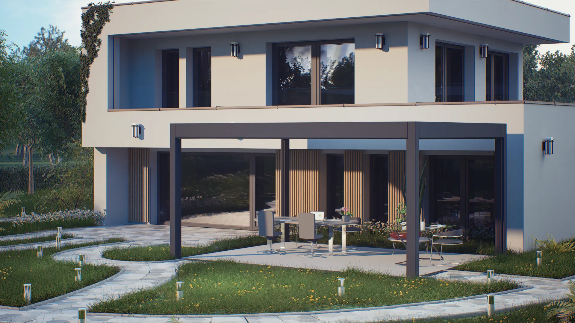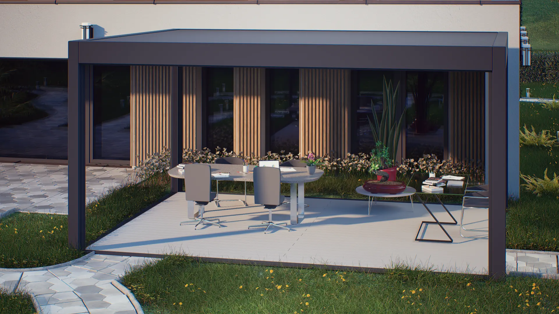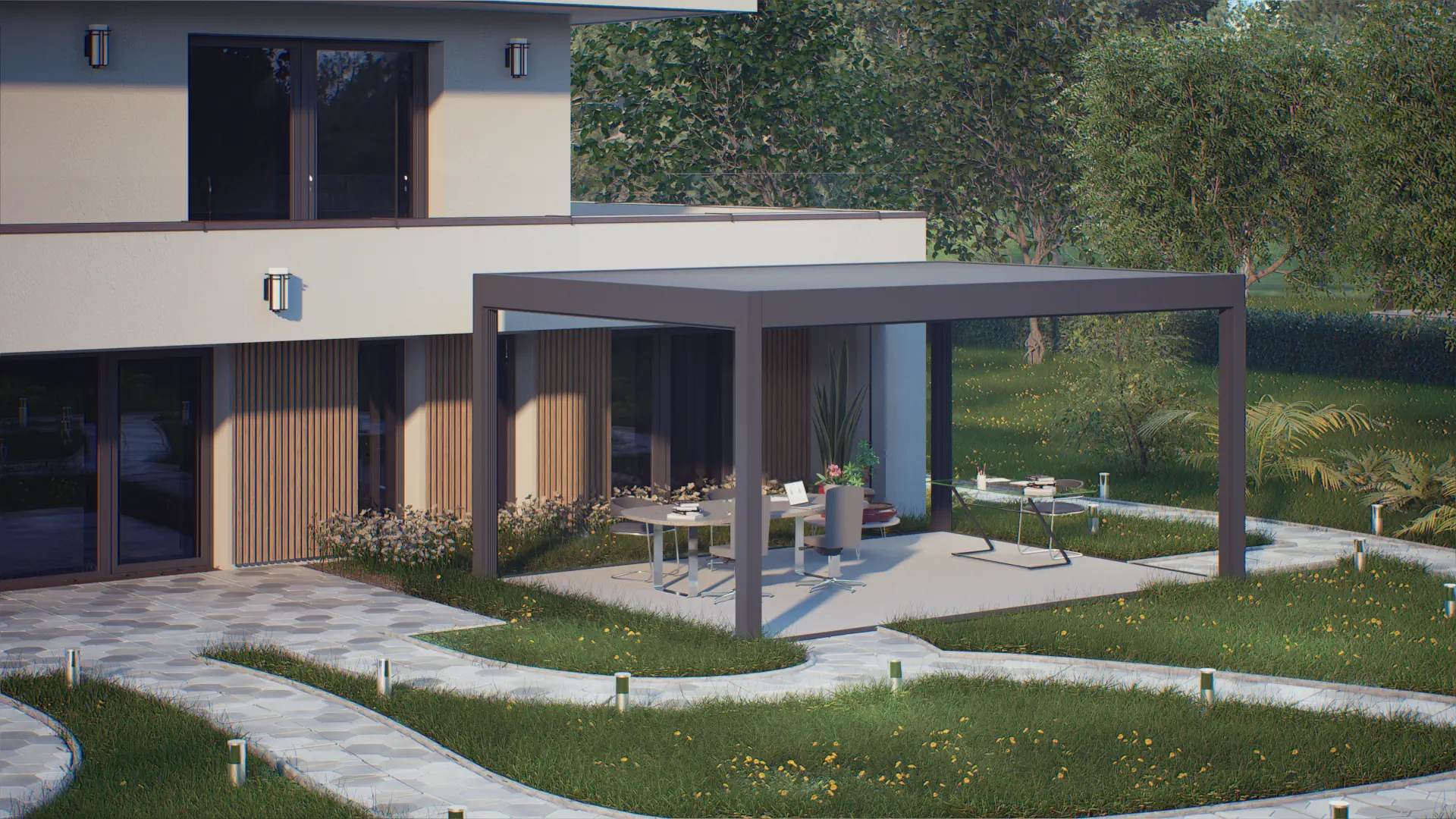 Навес сделан из экструдированного алюминия, не подверженного коррозии, что обеспечивает долговечность и минимальные требования к обслуживанию. Встроенная система водоотлива и крыша из сэндвич-панелей или стационарных ламелей защищают от неблагоприятных погодных условий, таких как сильные дожди и снегопады.