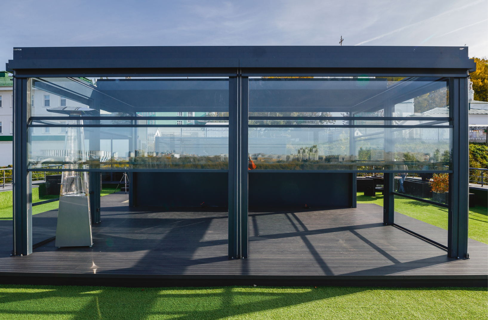Такое сочетание обеспечивает комфортный микроклимат внутри перголы в любую погоду, включая дождливую или ветряную. Причем при отсутствии ветра и осадков остекление поднимается, что позволяет находиться на открытом воздухе под навесом, защищающим от солнца.