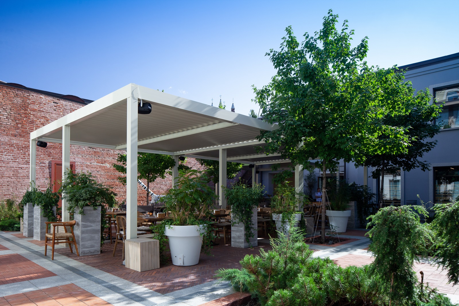 Выдвижная пергола — универсальный способ обеспечить приятный микроклимат как дома, так и на летней площадке кафе или ресторана. При минимальных расходах удается создать комфортные условия пребывания на свежем воздухе. В том числе — за счет эффективной защиты от осадков и солнца с помощью выдвижной крыши перголы. При незначительной доработке в виде установки ограждающих конструкций сооружение можно приспособить для круглогодичного использования.