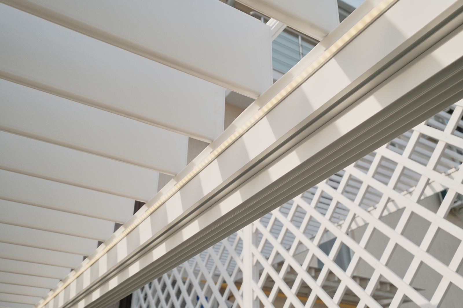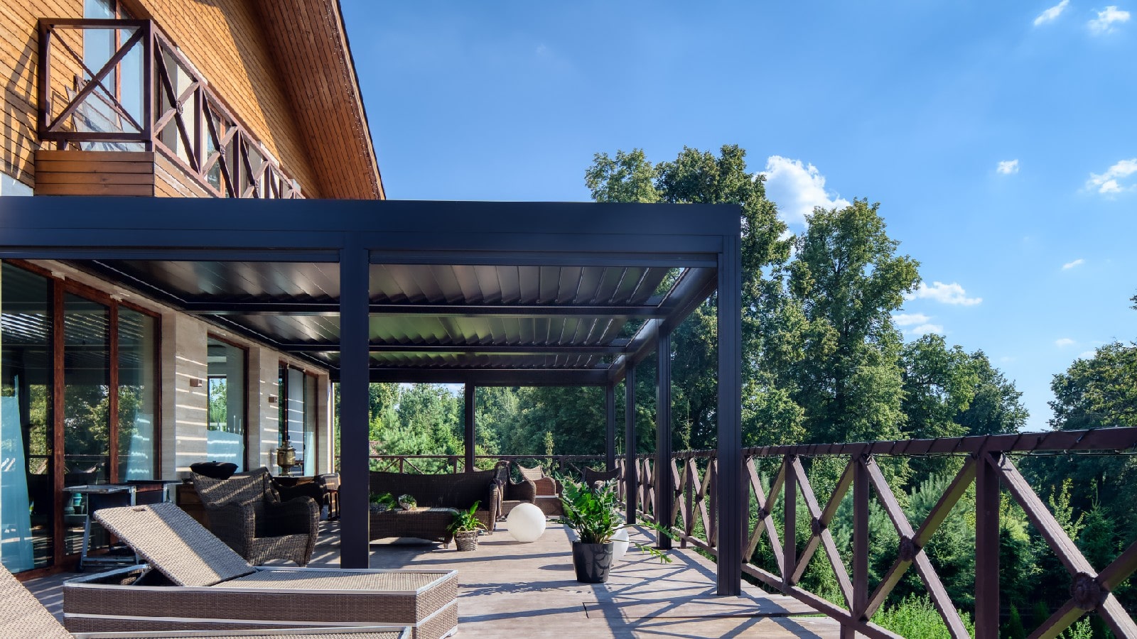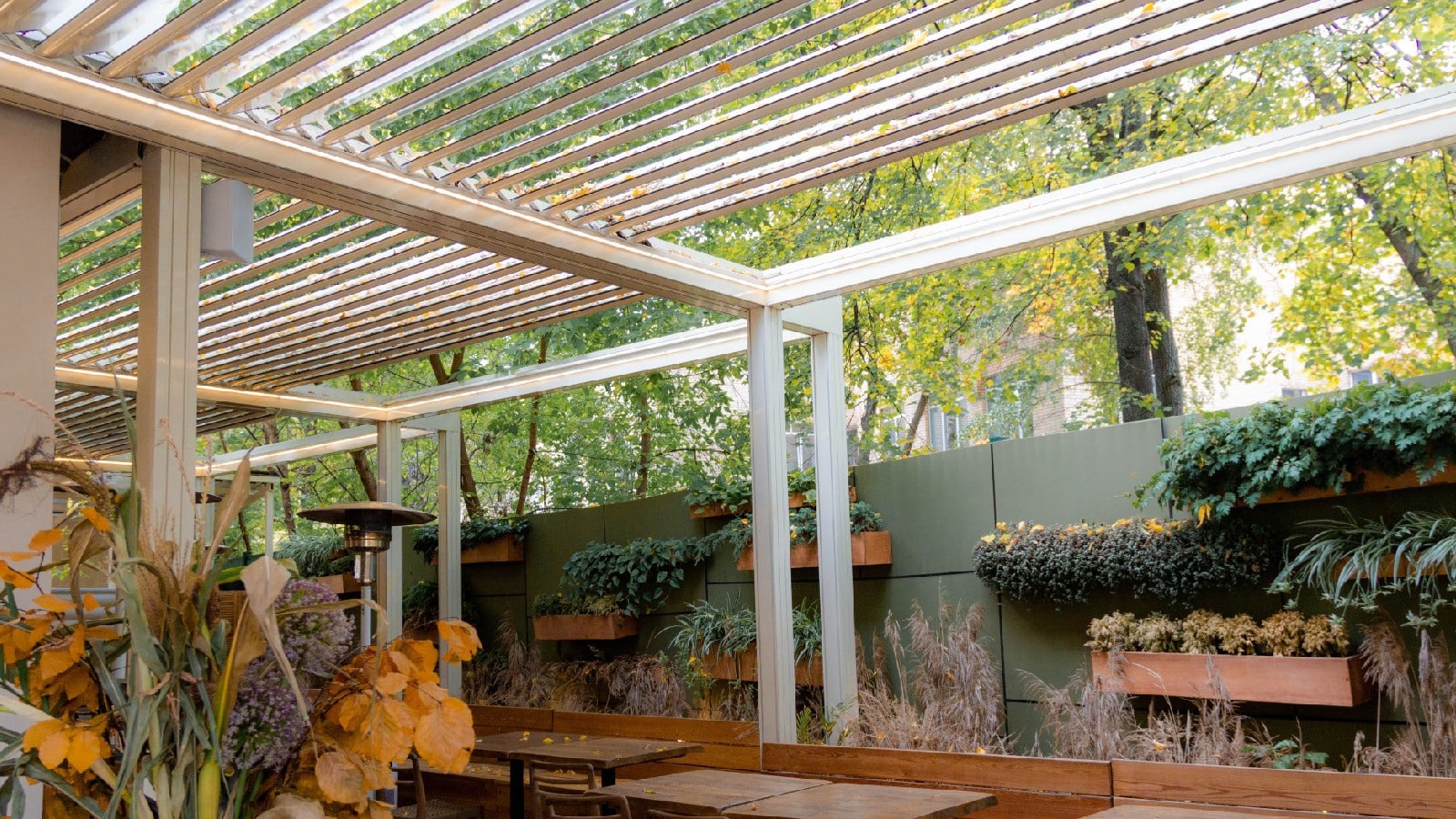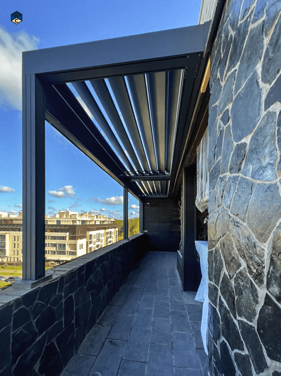 Важным дополнительным преимуществом изготовления выдвижных пергол становится возможность доработать конструкцию до полноценной биоклиматической. Для чего необходимо смонтировать стеновое ограждение и места его примыкания к крыше.
